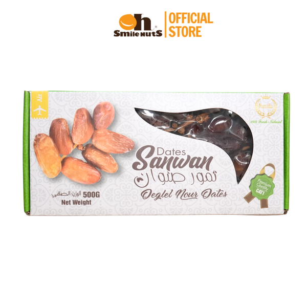 - Tên sản phẩm: Chà là khô nguyên cành Sanwan Deglet Nour hộp 500g